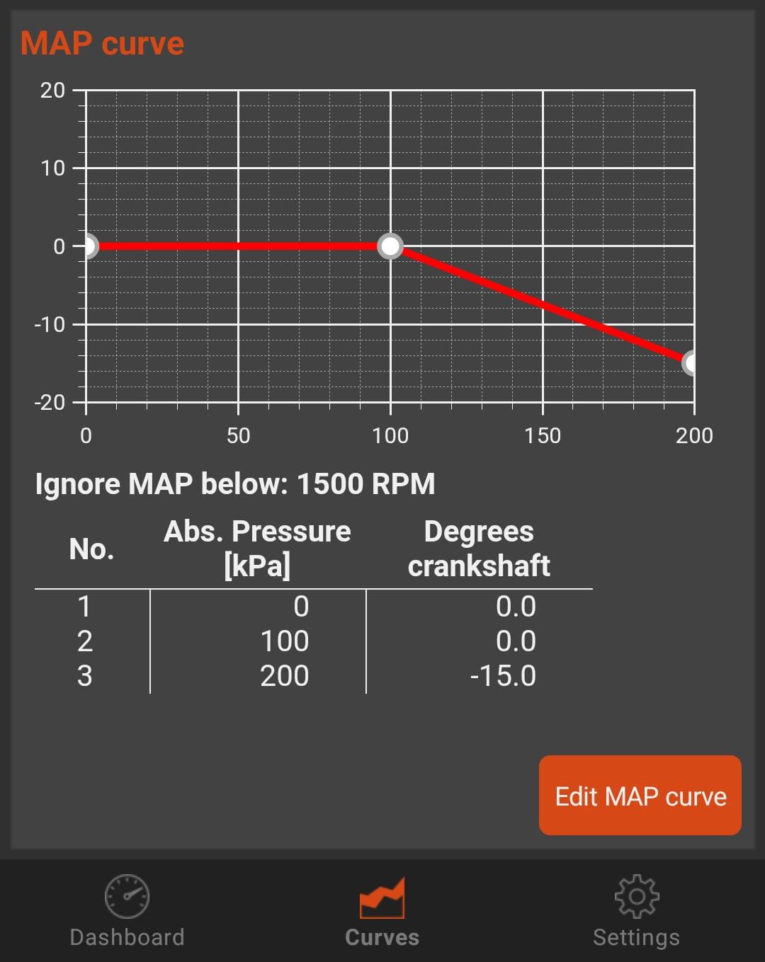 In einer Boost-Retard-Situation (Turbodruck) wird die Fliehkraftkurve auf die gleiche Weise eingestellt wie bei einer Standardzündkurve.