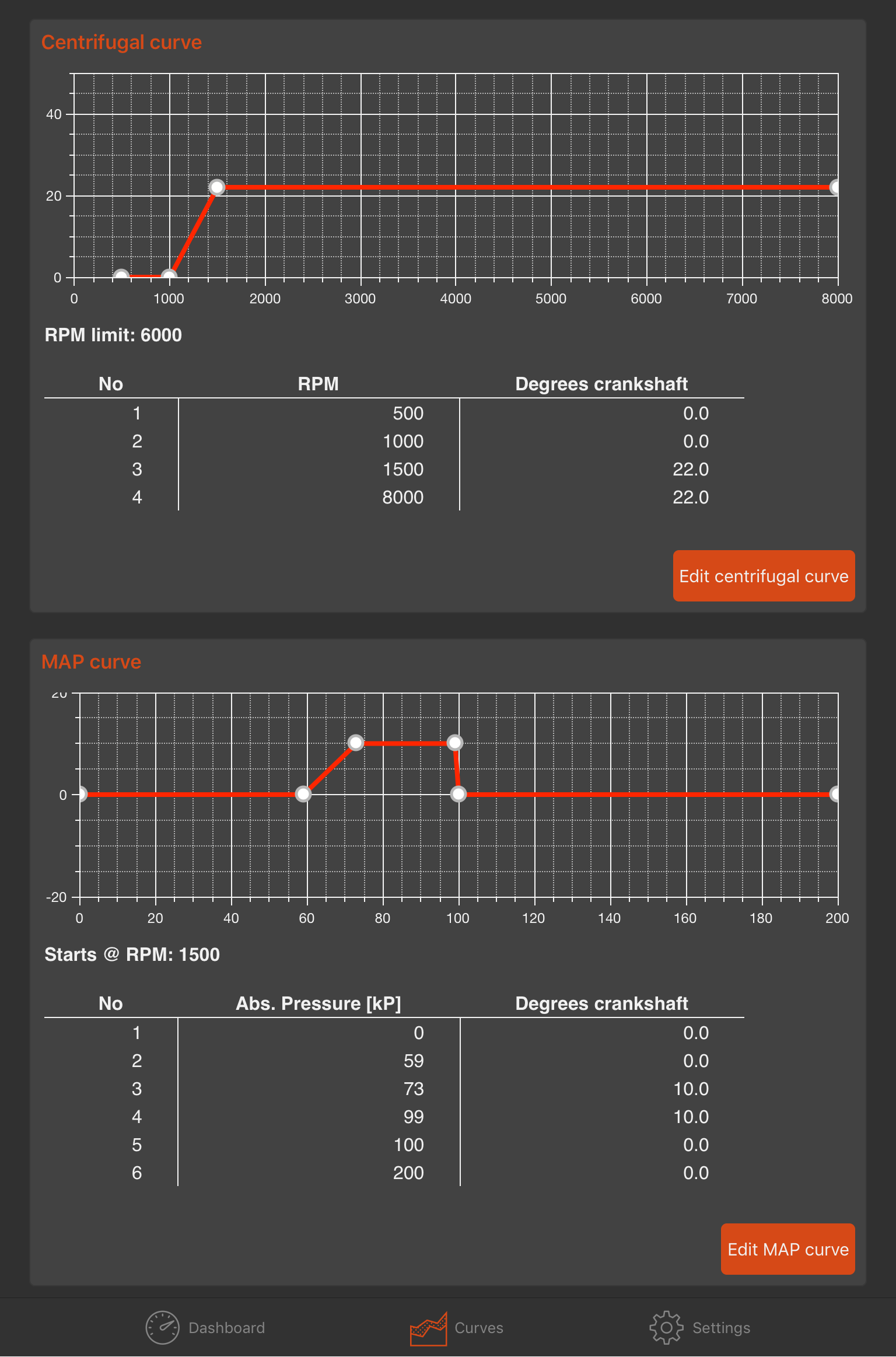 In beiden Fällen sehen Sie zwei Linien – das ist der Toleranzbereich, innerhalb dessen die tatsächliche Kurve liegen sollte. Für die Berechnung unserer Kurve nehmen wir die Mitte. Beachten Sie, dass die Kurve in der Grafik auf die Verteiler-Drehzahl bezogen ist; in der App verwenden wir die Kurbelwellendrehzahl.