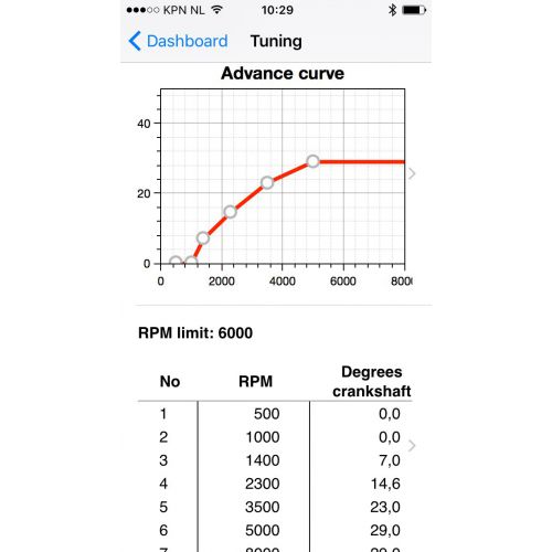 - Avance de vacío- y boost-retard curva (0 a 200 kPa o -30 inHg a +15 psi).