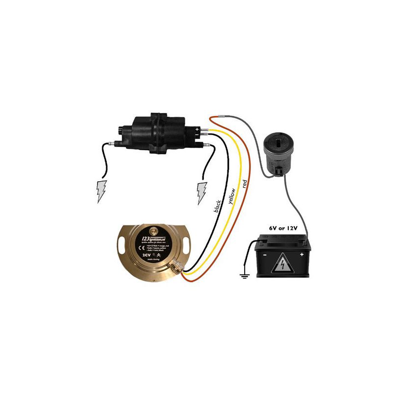 The 123/UNI is designed to work on 2CV 9hp, 375cc, A53, M4, A79/0, M28, A79/1 and M28/1 engines in conjunction with the standard black coil. A 6 Volt type is available for 6 Volt batteries and a 12 Volt type for 12 Volt batteries. The dwell is automatically adjusted.