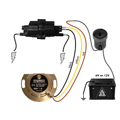 The 123/UNI is designed to work on 2CV 9hp, 375cc, A53, M4, A79/0, M28, A79/1 and M28/1 engines in conjunction with the standard black coil. A 6 Volt type is available for 6 Volt batteries and a 12 Volt type for 12 Volt batteries. The dwell is automatically adjusted.