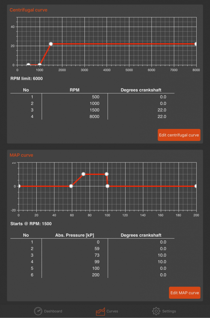 In most cases, a standard engine uses both centrifugal and vacuum advance. In the graph below, the centrifugal curve is shown as a solid line, while the vacuum curve is shown as a dashed line. In both cases, two lines are shown. This is the margin within which the actual curve should fall. For our curve calculation, we take the middle. Note that the curve in the graph is based on ignition RPM; in the app, we use crankshaft RPM.