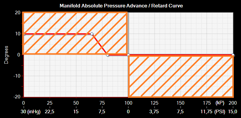 Because we are using vacuum retard instead of advance, a new challenge arises. The graph below shows that only the orange areas can be programmed. In the vacuum range, normally only advance is applied; in overpressure, retard is applied (turbo/boost retard).