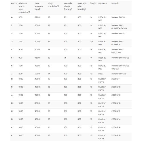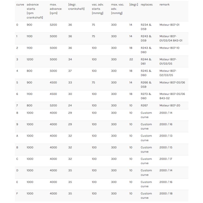 The 123/Renault16-TX-TS-4-R-V contains curves for carbureted-engines as originally specified by Renault. The end-user can select one of 16 different advance-curves by means of a little switch on the side of the distributor-body.