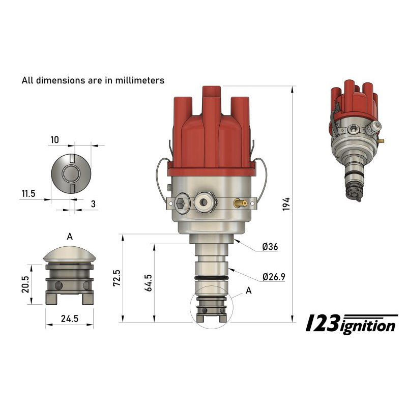 Model "D" vervangt de meeste verdelers, zoals gebruikt door Alfa (gelieve de afmetingen te vergelijken voordat u bestelt). De 123/TUNE-6-R-V-D voor 6 cilinders wordt geleverd met een rechte kap.