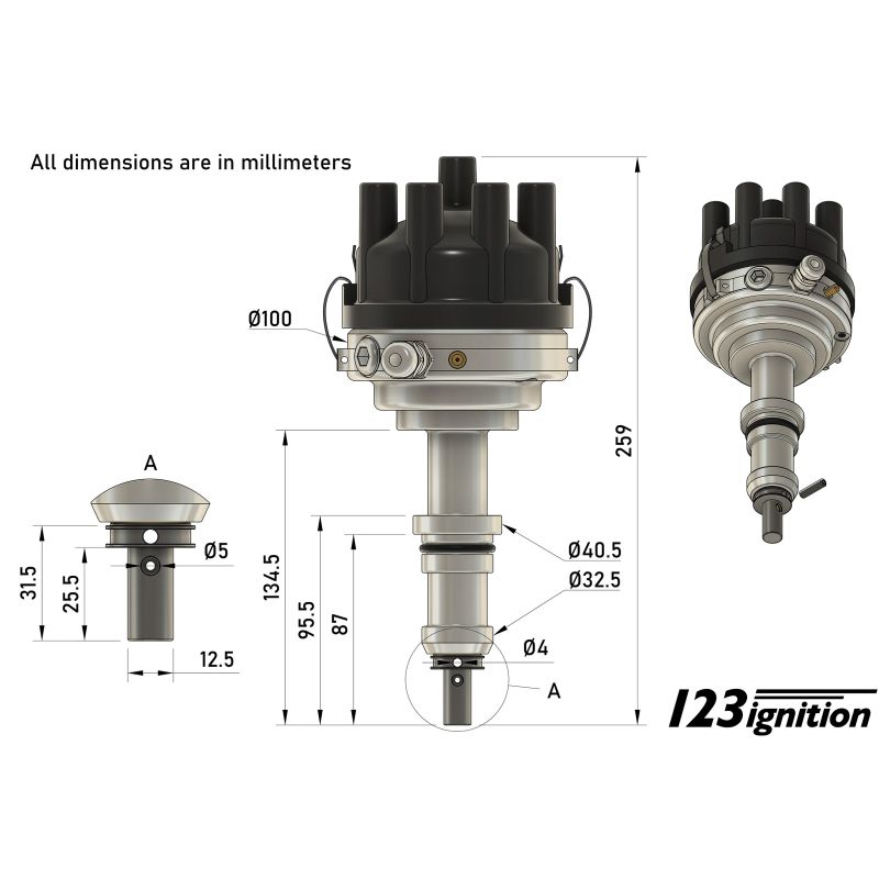 Model "Rover-V8" vervangt verdelers, zoals gebruikt door Rover V8 motoren (SD1 motoren); deze zijn vanaf 1976 geproduceerd (gelieve de afmetingen te vergelijken voordat u bestelt). Voor de meeste pre SD1 motoren kunt u de 123/TUNE-Rover-preSD1 bestellen. De 123/TUNE-ROVER-V8 voor 8 cilinders wordt geleverd met een rechte kap.