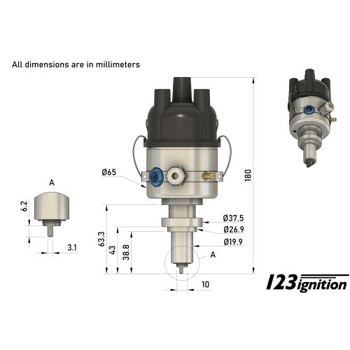 UWAGA! Ta 123ignition bardzo przypomina 123/TUNE+ 4-R-V-Renault-OLD. Proszę dokładnie porównać długość wału (część, która znajduje się w silniku). W przypadku Renault-Dauphine długość ta wynosi 39mm; w przypadku Renault-OLD wynosi 29mm.